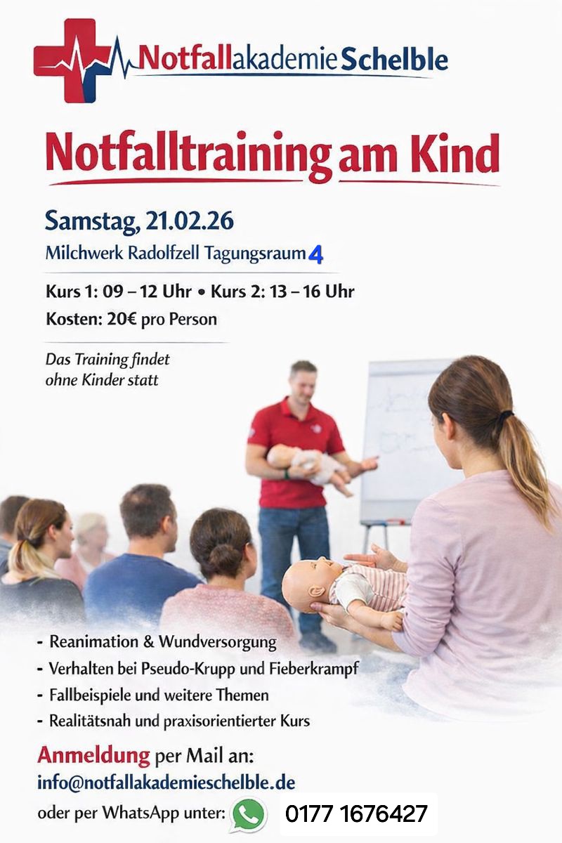 | 20€Am Samstag, 21. Februar 2026, findet im Milchwerk Radolfzell, Tagungsraum 4, ein praxisnahes Notfalltraining am Kind statt. Veranstalter ist die Notfallakademie Schelble, die sich auf realitätsnahe Erste-Hilfe- und Notfallkurse spezialisiert hat.
